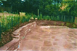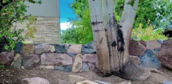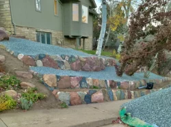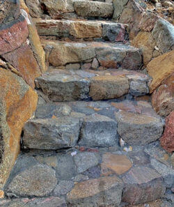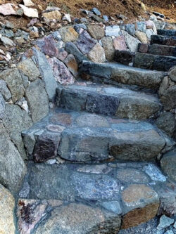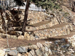 Our walls are backfilled with more stone that is puzzled behind the walls and hammered into place for ultimate structural integrity. Also, the use of rock as a backfill keeps the walls clean of weeds for that perfect look all the time. Our staircases are laid in crusher fines which is ground-up rock. Crusher fines offer superior stability in packing, are able to drain from rain and snow, and act as a weed barrier keeping them maintenance-free.